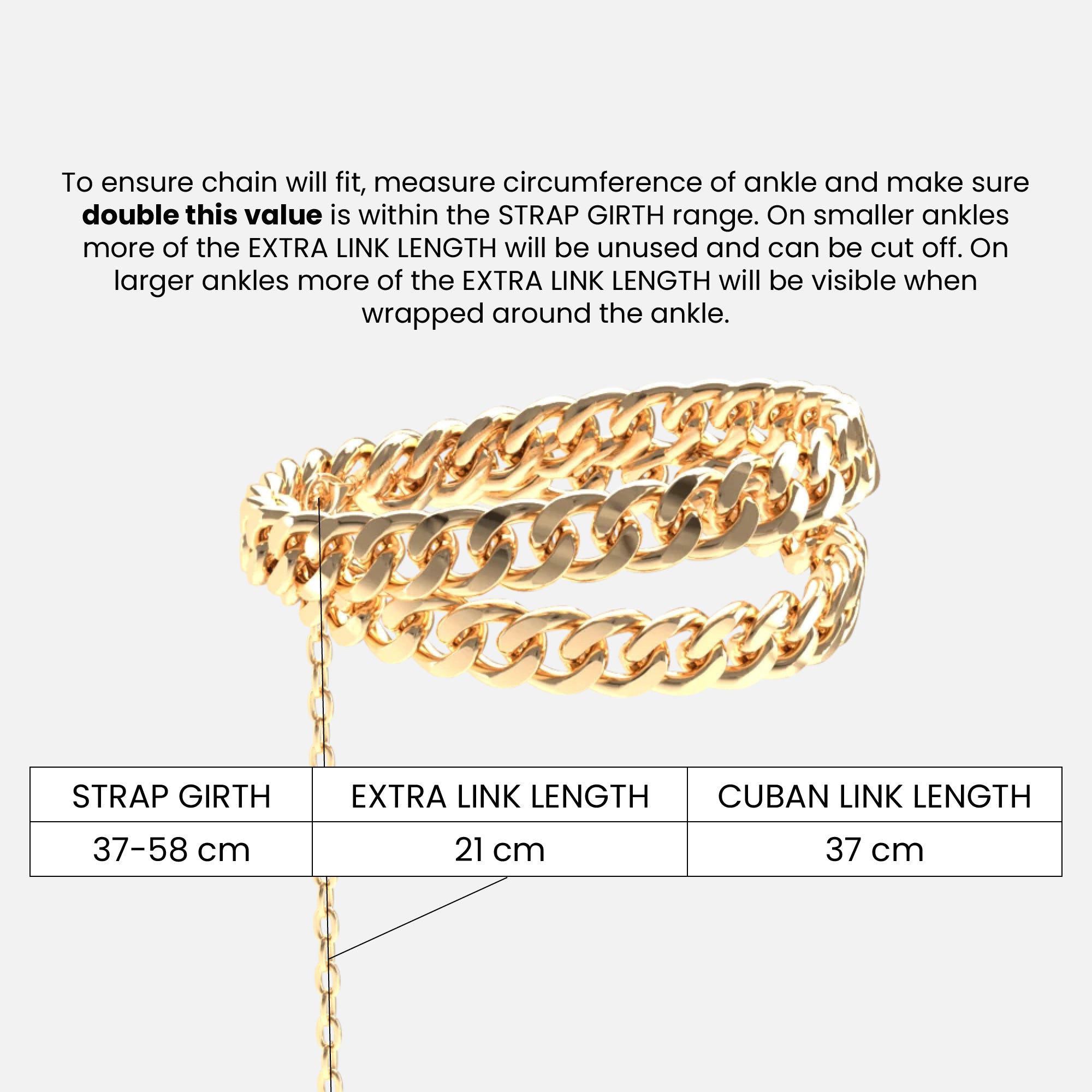 Customization just got an upgrade with our interchangeable ankle chains. This pair of chains may be swapped onto our Pashionista, D'Orsay & Jocelyn styles, adding an extra touch of glam to any look. They may also be worn anklet-style atop strap-less styles for an extra touch of glam. The adjustable clasp closure accommodates varying ankle widths. The Gold Double Cuban Chain is designed to wrap twice around your ankle for a layered look.